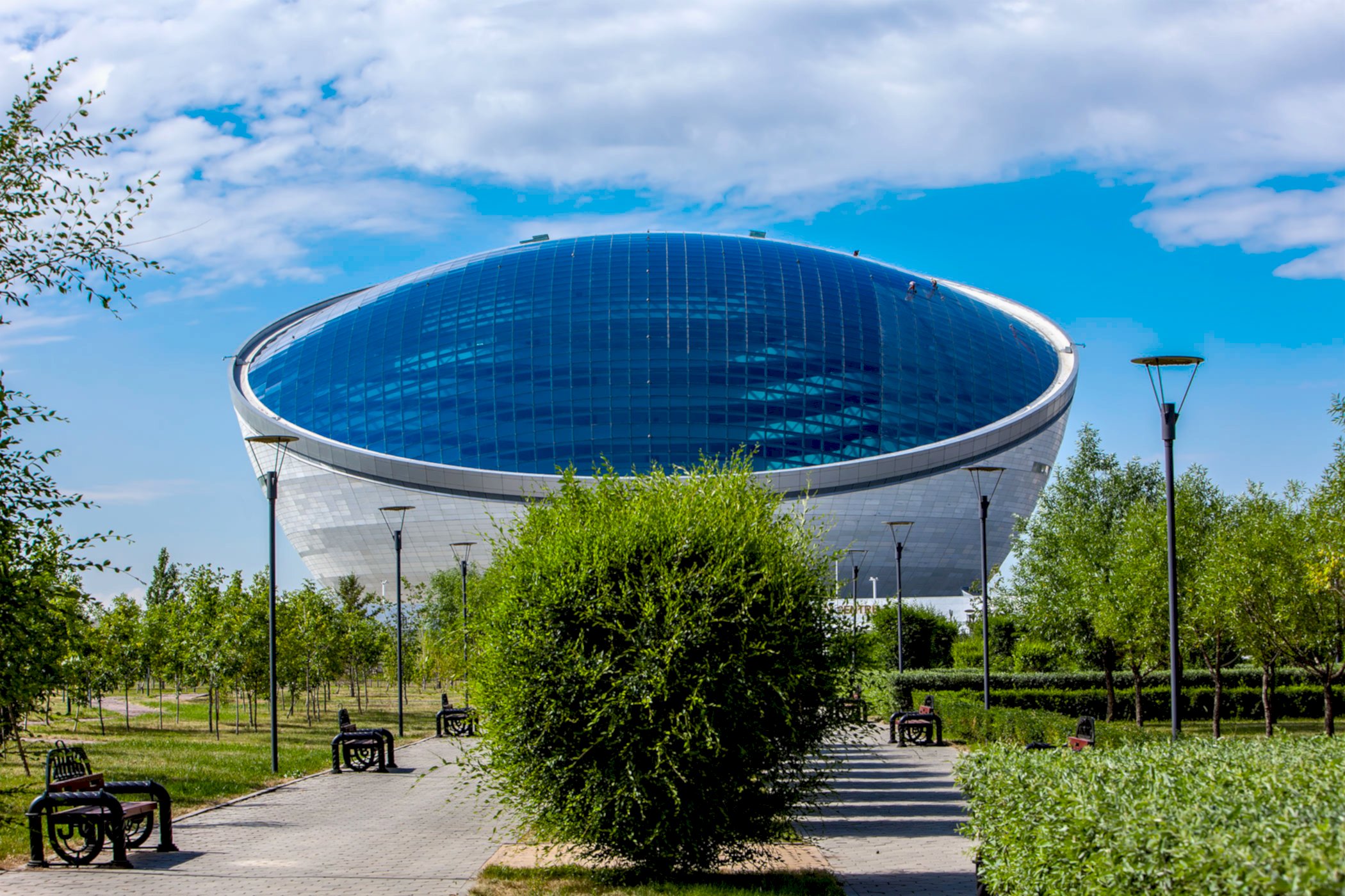 Engineering, design, fabrication and installation of 6.500 m2 double glazed single layer skylight in spherical form, installed onto a 90m diameter circular building with 20 deg. Slope. Steel member sizes are only RHS300x200